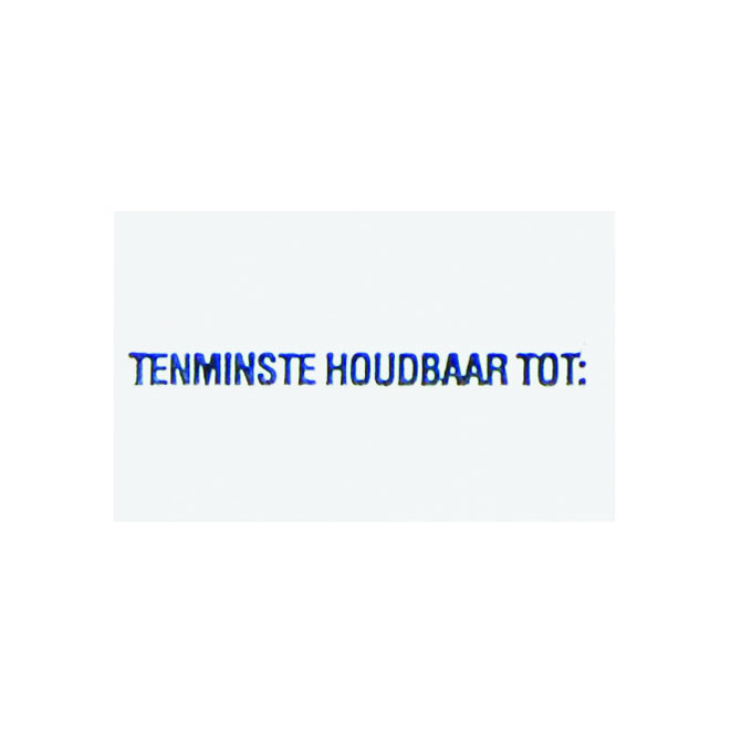Bedrukt in het zwart met TENMINSTE HOUDBAAR TOT (in het midden van het etiket, voluit geschreven).