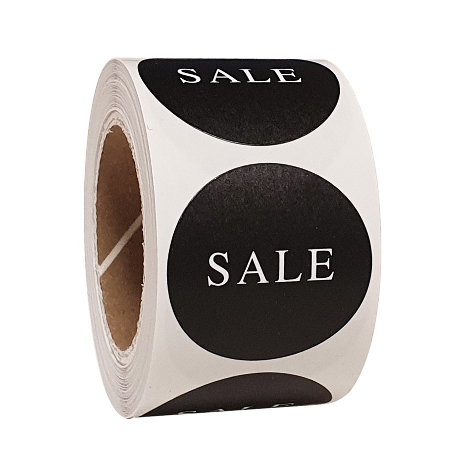 De etiketten zijn zwart met witte tekst SALE. Ronde stickers die worden gebruikt om artikelen mee af te prijzen of aanbiedingen te presenteren.
