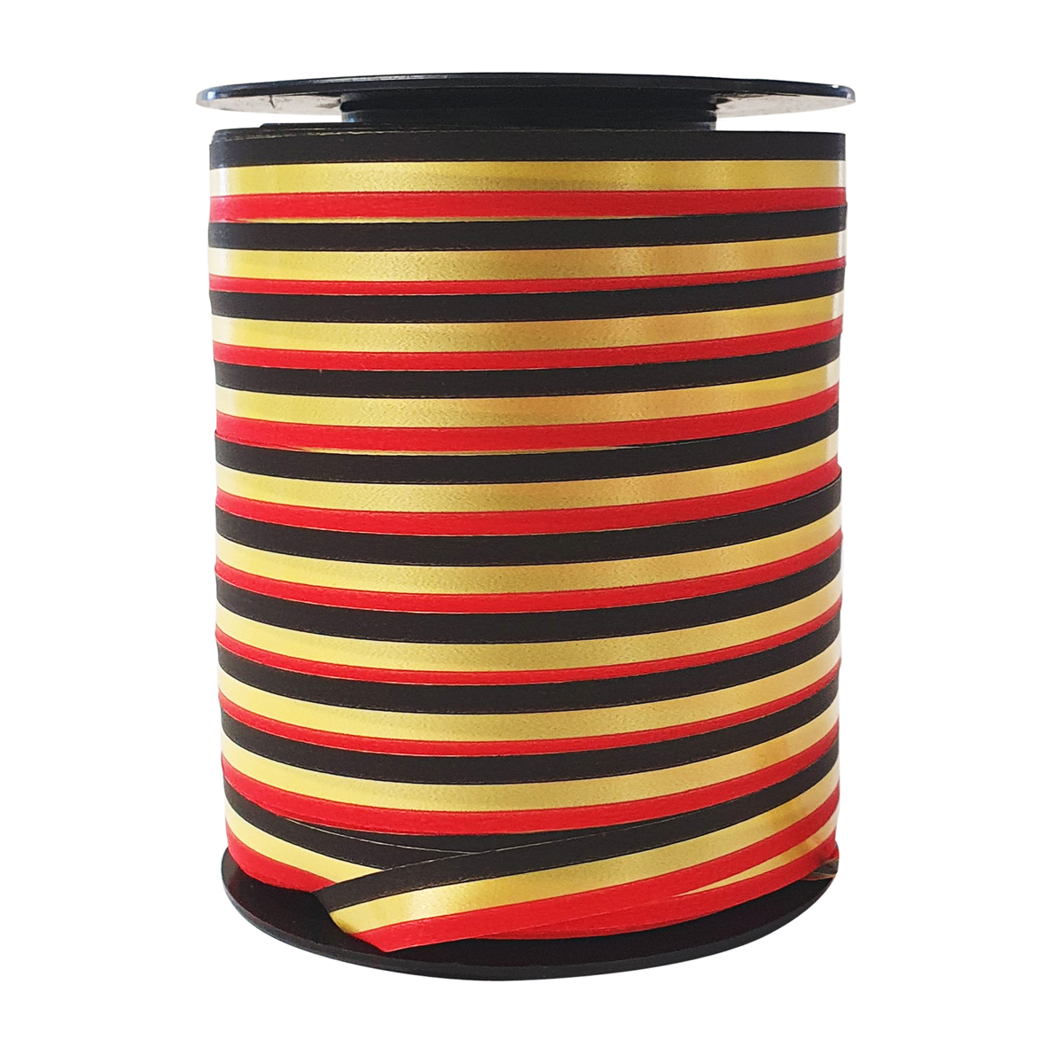 Meerkleurig cadeau lint in de kleuren van de Belgische vlag. Het lint is 10mm breed, de totale lengte van de spoel is 250 meter.