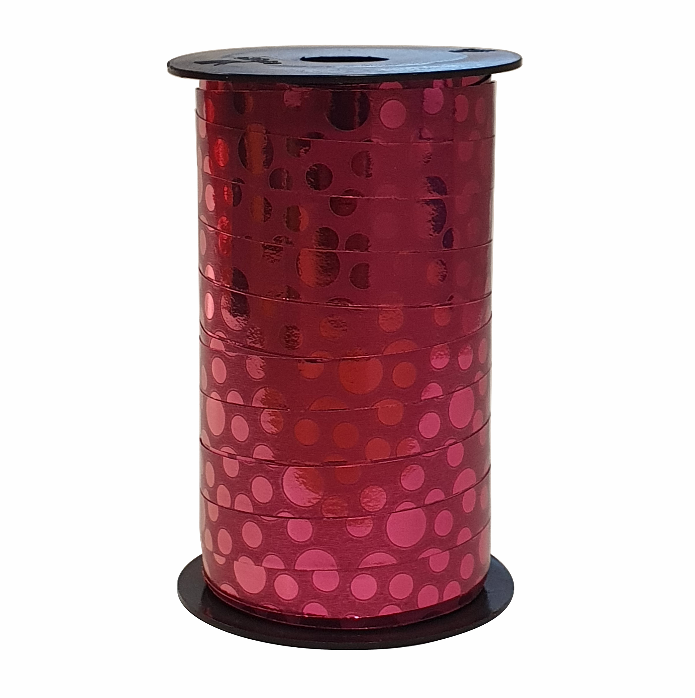 Fuchsia krullint van 10mm breed met cirkelvormige opdruk met glanzend laag, de totale lengte van de spoel is 50 meter.