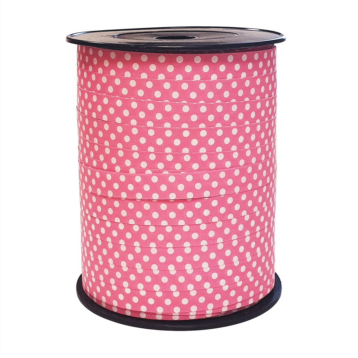 Donkerroze krullint met wit stippenpatroon. Het lint is 10mm breed en de totale lengte van de spoel is 250 meter.