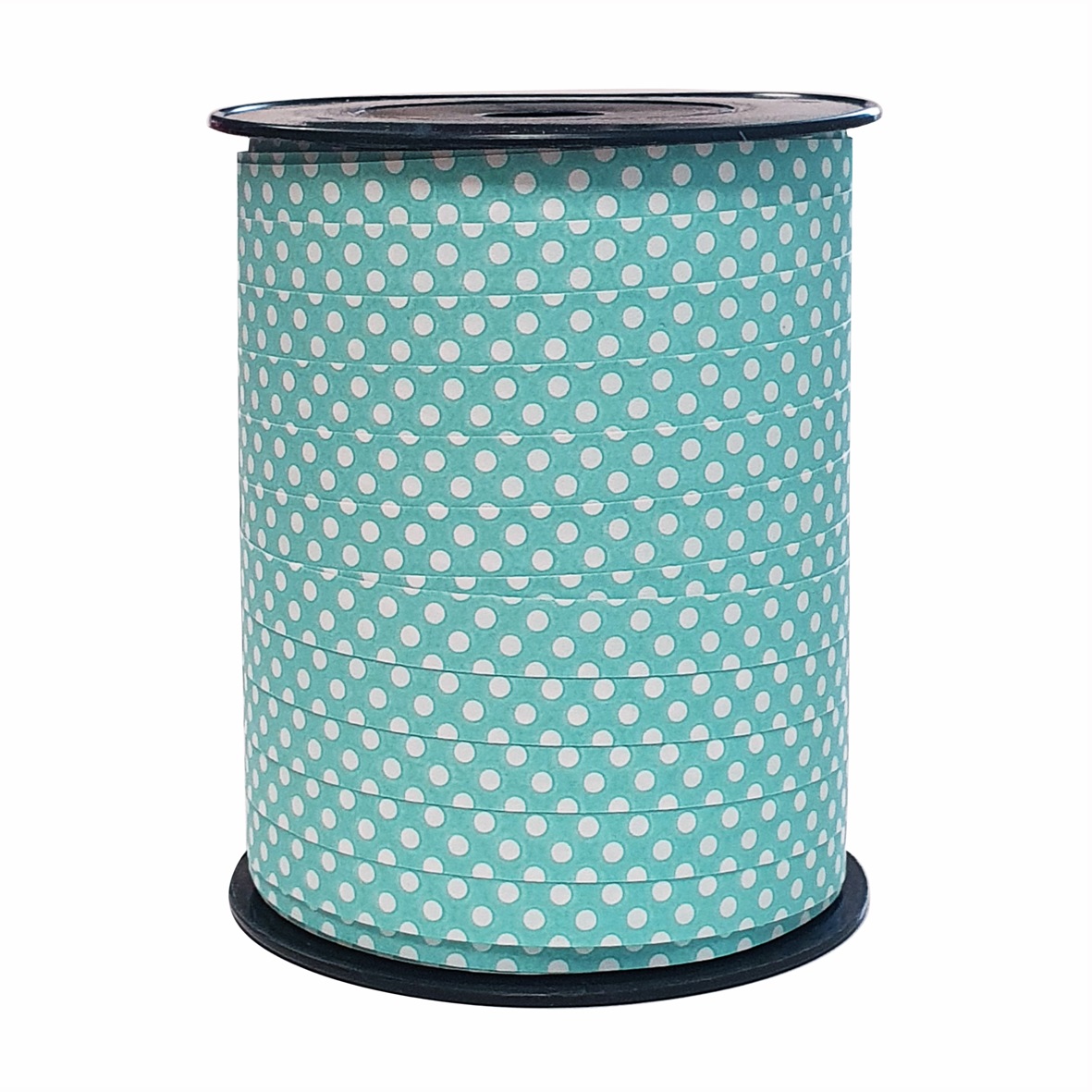 Mintgroen krullint met wit stippenpatroon. Het lint is 10mm breed en de totale lengte van de spoel is 250 meter.
