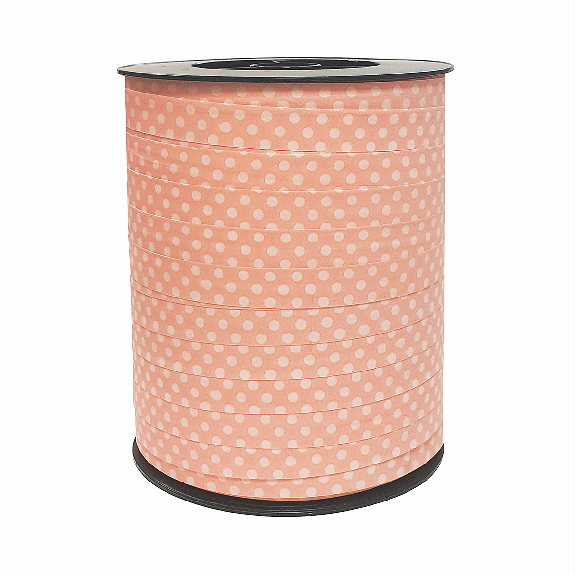 Roze krullint met wit stippenpatroon. Het lint is 10mm breed en de totale lengte van de spoel is 250 meter.