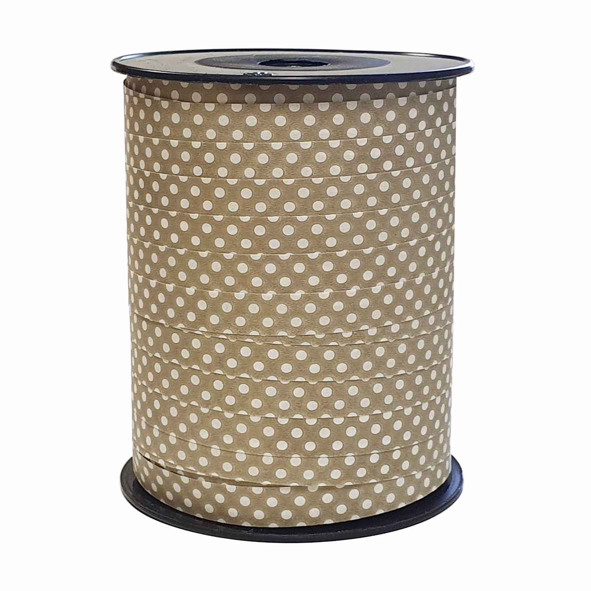 Taupe krullint met wit stippenpatroon. Het lint is 10mm breed en de totale lengte van de spoel is 250 meter.