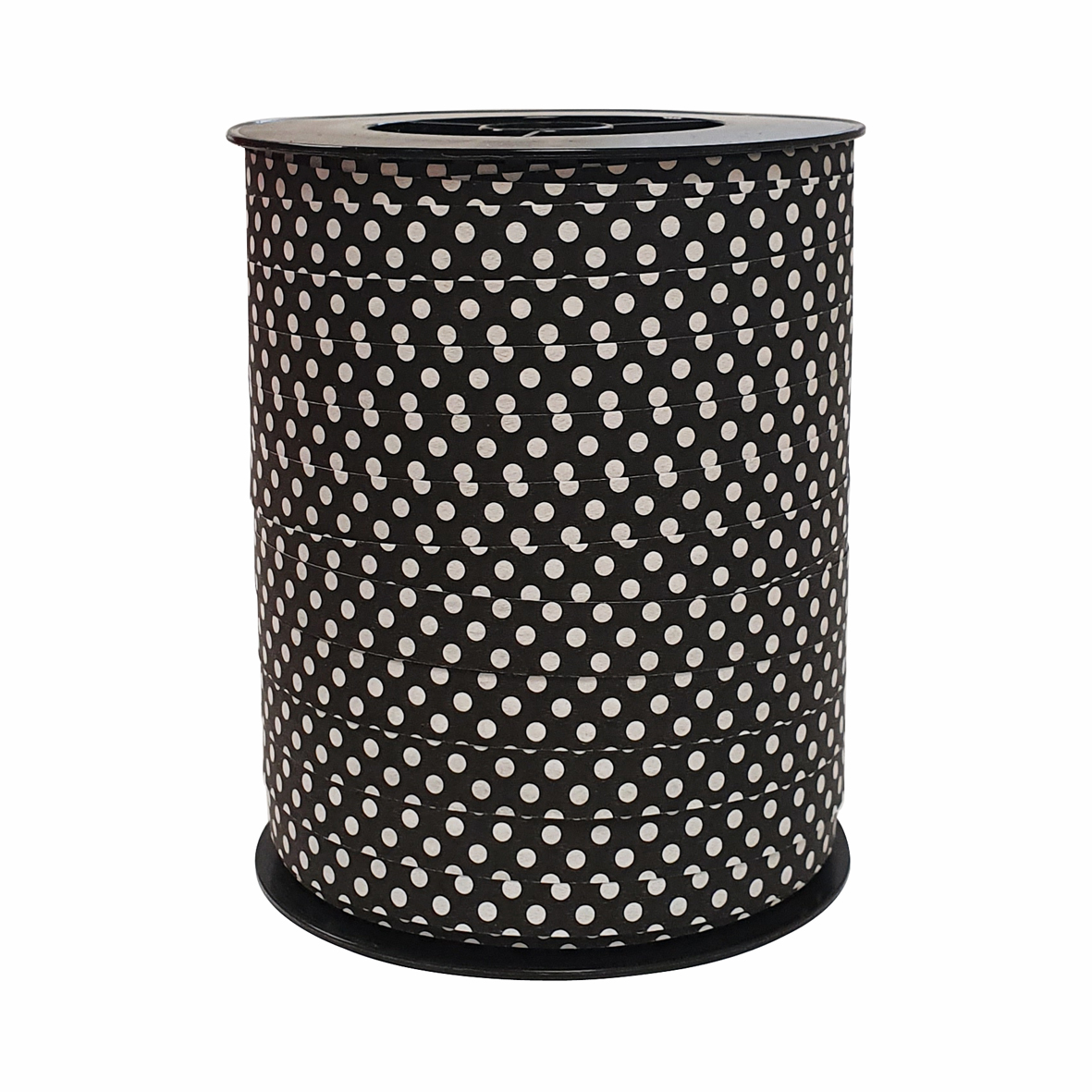 Zwart krullint met wit stippenpatroon. Het lint is 10mm breed en de totale lengte van de spoel is 250 meter.