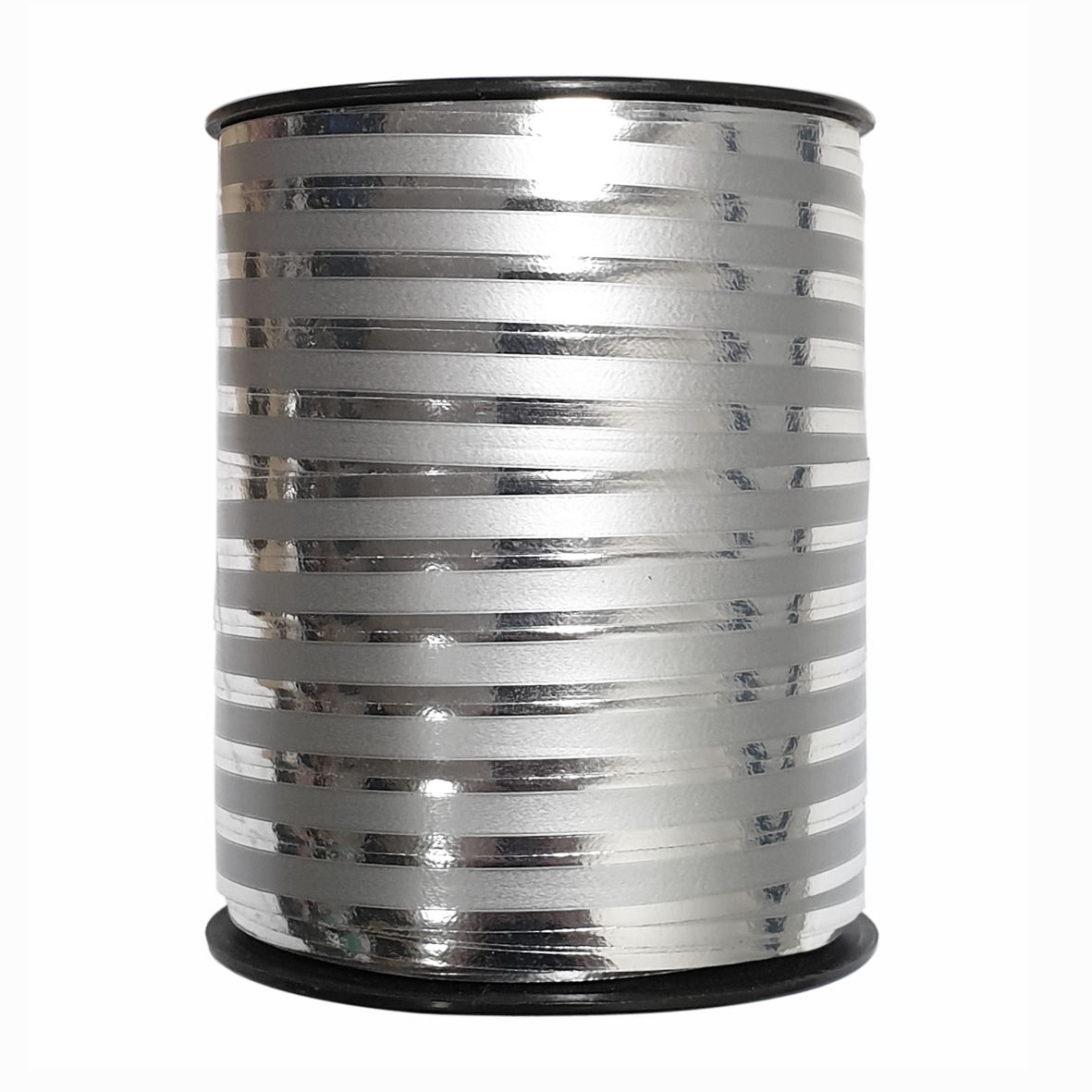 Metallic mat zilverkleurig krullint van 10mm breed, de totale lengte van de spoel is 250 meter.