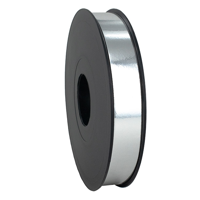 Metallic zilverkleurig krullint van 19mm breed, de totale lengte van de spoel is 100 meter.