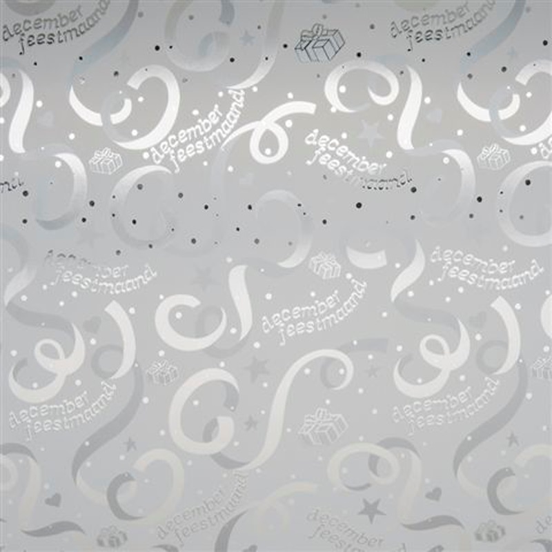 Het cadeaupapier heeft de opdruk December Feestmaand in het glanzend zilvergrijs. De achtergrond van het cadeaupapier is lichtgrijs.