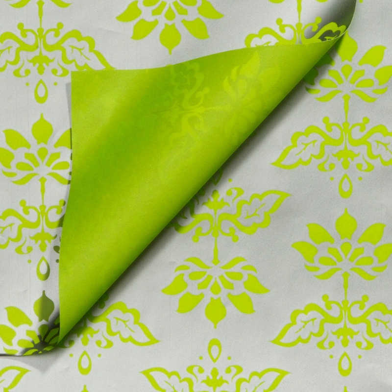Het inpakpapier is bedrukt met groene bloemen. De achtergrond is aan de ene kant zilvergrijs en aan de andere kant groen.