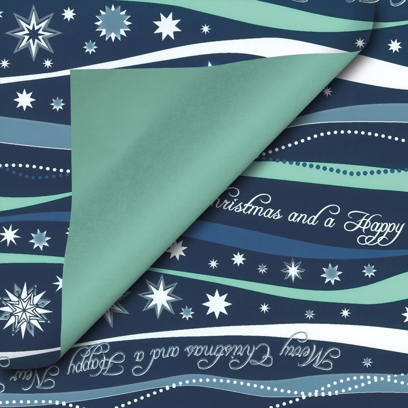 De achtergrond van het cadeaupapier is donkerblauw en er staan details op met strepen en sterren. De andere kant van het papier is lichtblauw.
