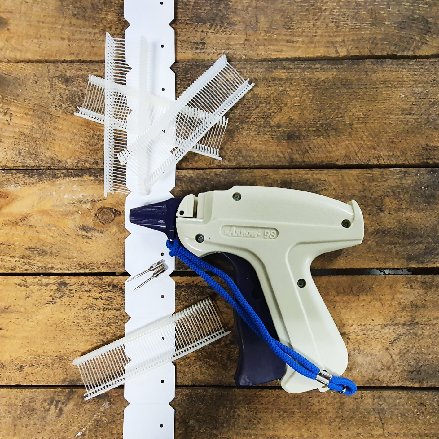 Complete set Arrow 9S. Een standaard ridderspoortang van het merk Arrow, geschikt om prijskaartjes aan kledingstukken te bevestigen.