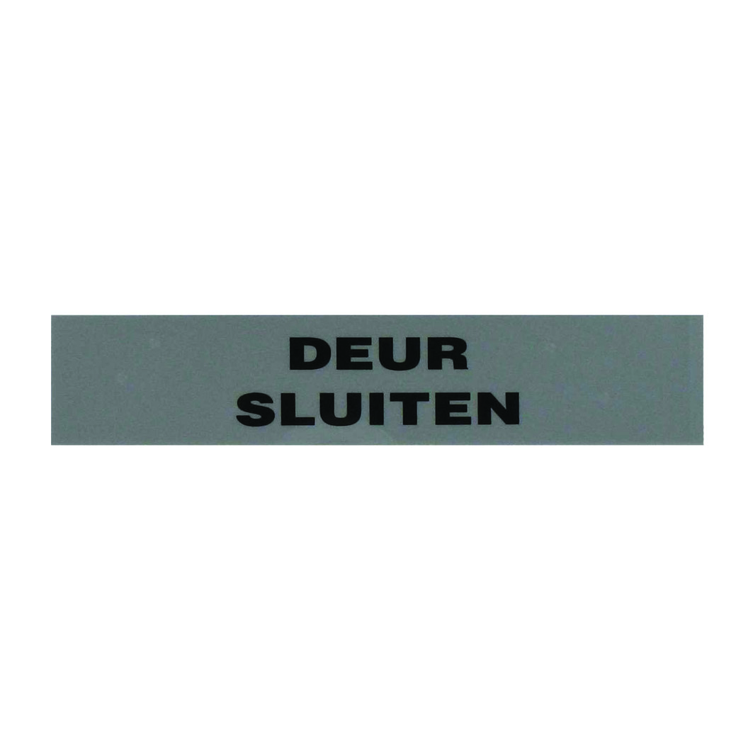 Deurplaatje DEUR SLUITEN grijs/zwart. De afmeting is 21x4cm.