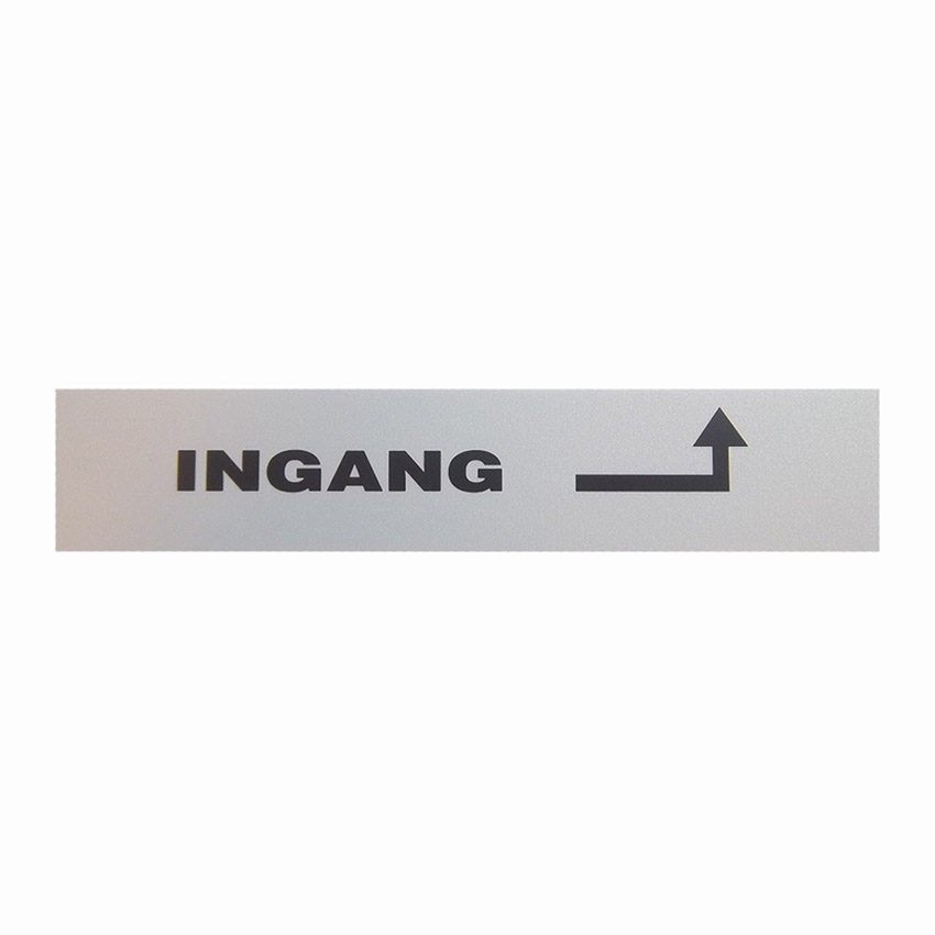 Deurplaatje INGANG met pijl grijs/zwart. De afmeting is 21x4cm.
