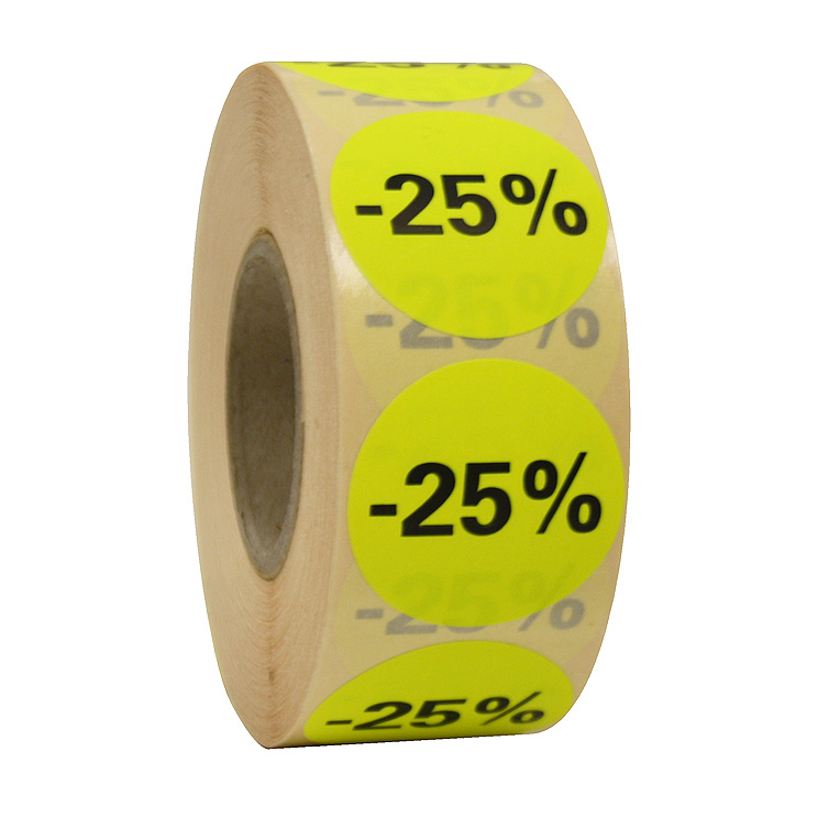 Etiketten in fluorescerend geel met zwarte opdruk -25%, geschikt voor het afprijzen van artikelen met 25% korting.