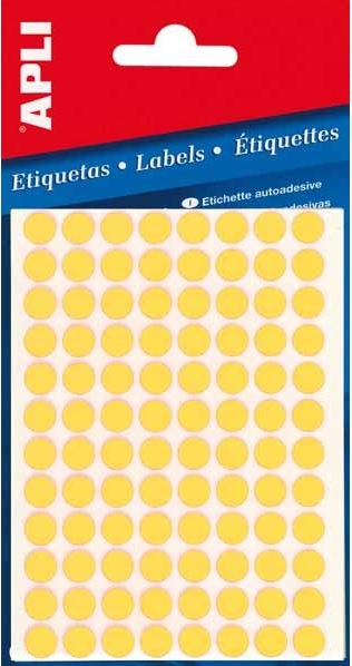 Fluorescerend gele blanco etiketten van het merk Apli met een doorsnee van 8mm per label, geschikt om zelf te beschrijven.