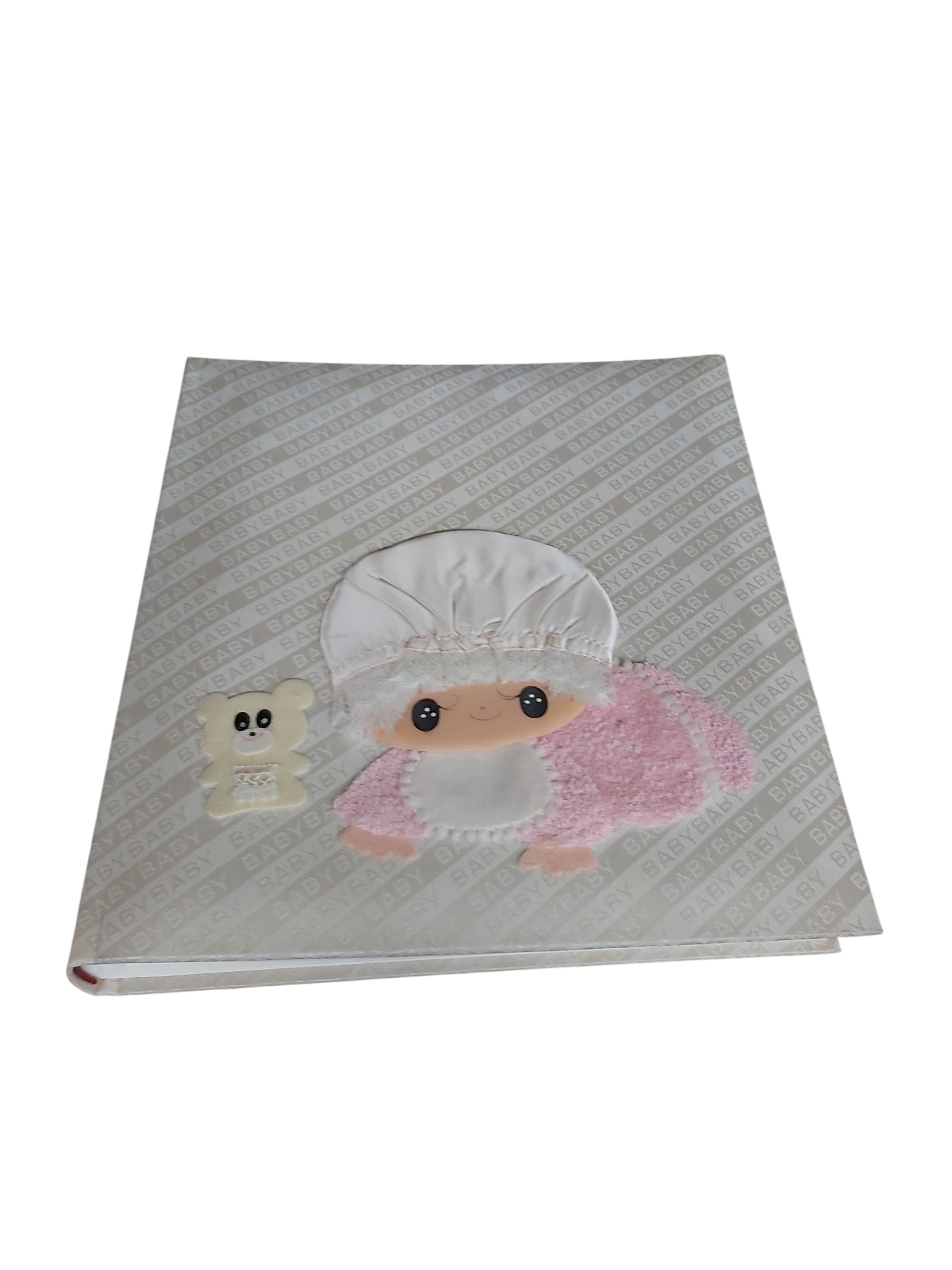 Het fotoalbum is geschikt om babyfoto’s van een meisje in te plakken; de baby op de kaft draagt roze kleding en heeft een beertje.