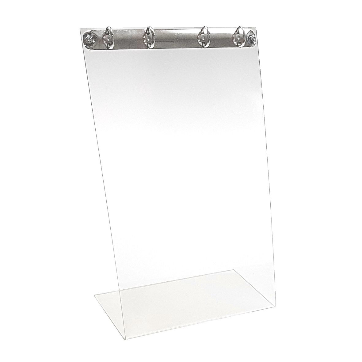 Transparante kaarthouder of folderstandaard van acryl in een L-vorm inclusief mechanisme aan de bovenzijde.