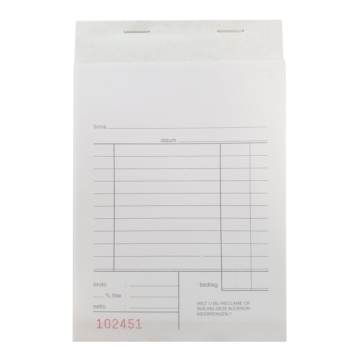 Genummerd rekeningblok in het formaat 10,5 x 15cm. Het blok is voorzien van een carbon velletje, inclusief een kolom voor de BTW.