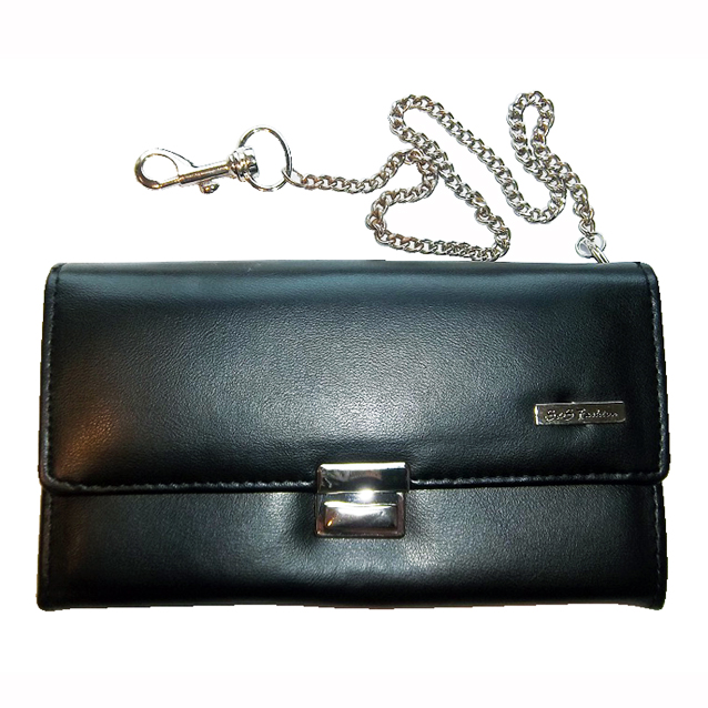 Kunstleder met ketting en draaibare karabijnhaak. Het formaat is breed 17,5cm x hoog 10cm x diep 3cm, gemeten zonder inhoud.