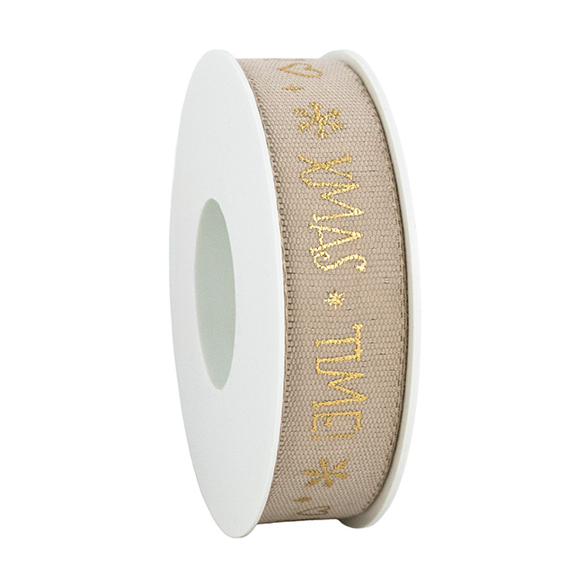 Stoffen lint crème 25mm breed x 15 meter met goudkleurige opdruk X-MAS.