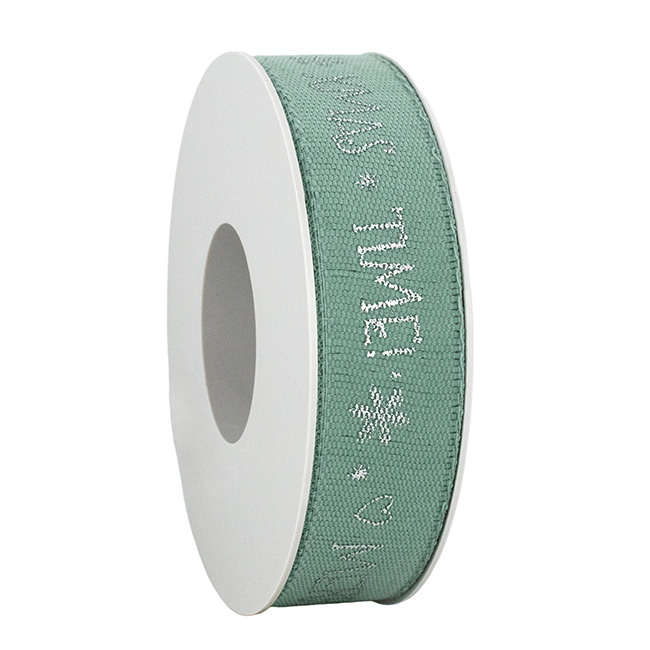 Stoffen lint groen 25mm breed x 15 meter met zilverkleurige opdruk X-MAS.