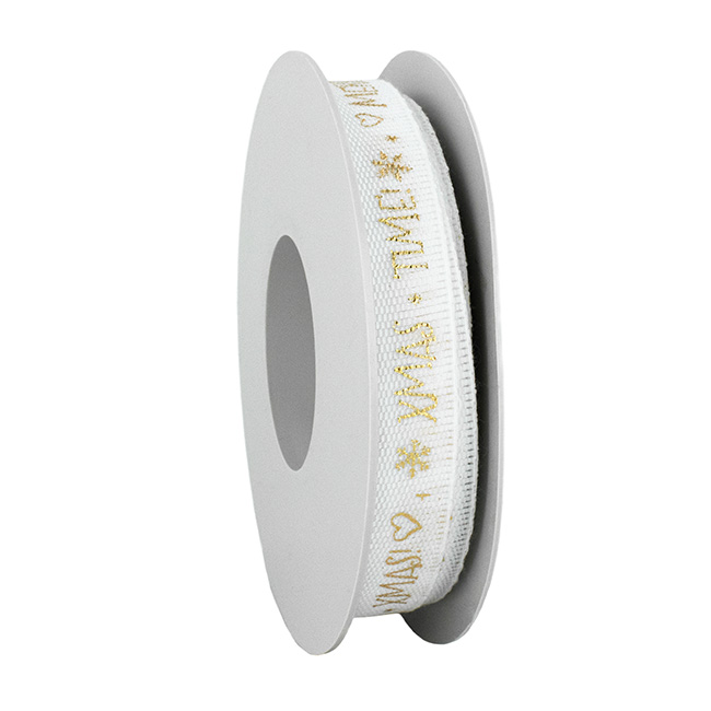 Stoffen lint wit 15mm breed x 15 meter met goudkleurige opdruk X-MAS.
