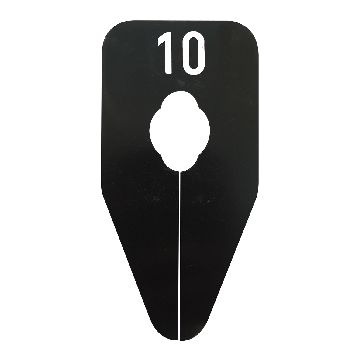 Ovaalvormig maatbordje in het zwart met witte opdruk voor maat 10, geschikt om bijvoorbeeld op een kledingrek te bevestigen.