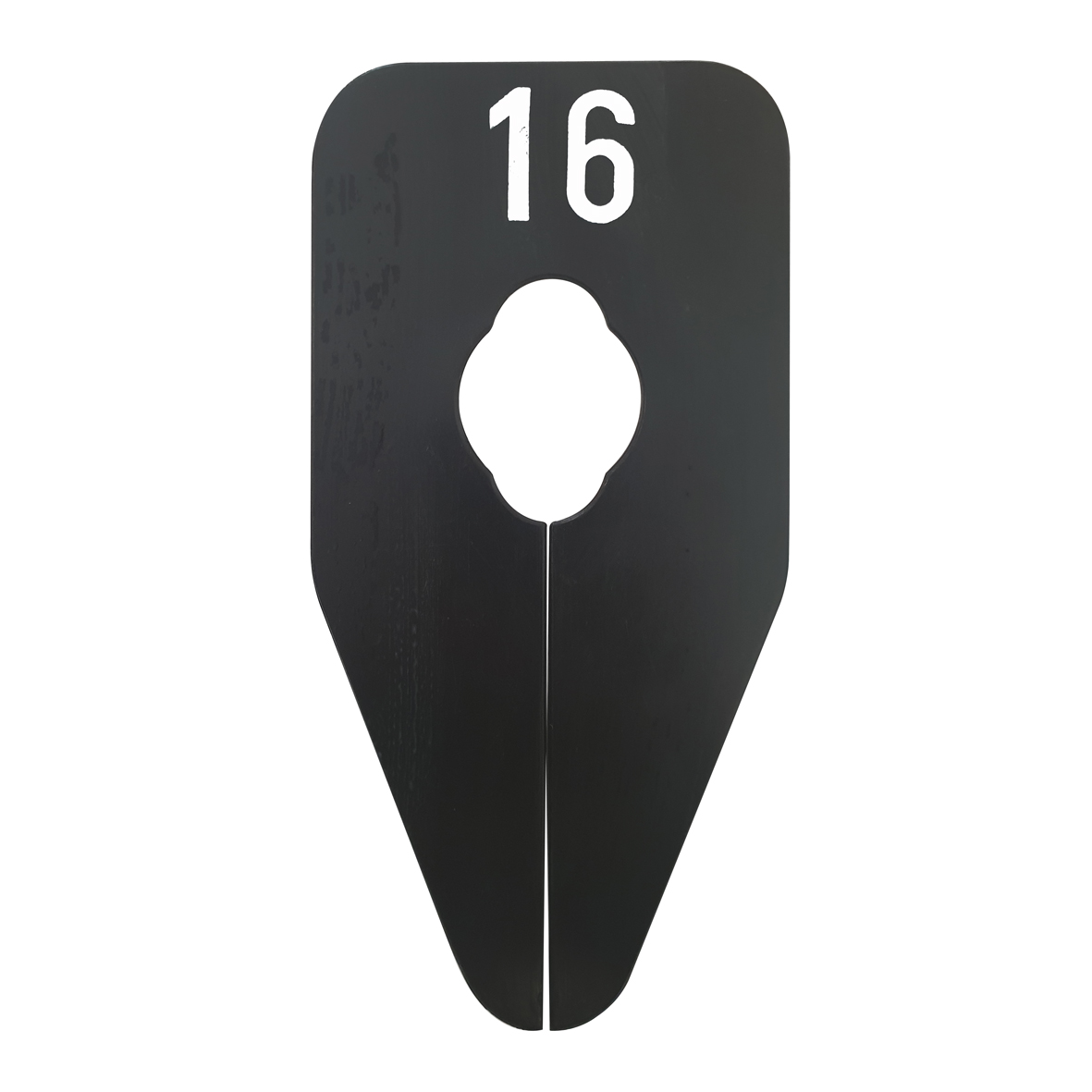 Ovaalvormig maatbordje in het zwart met witte opdruk voor maat 16, geschikt om bijvoorbeeld op een kledingrek te bevestigen.