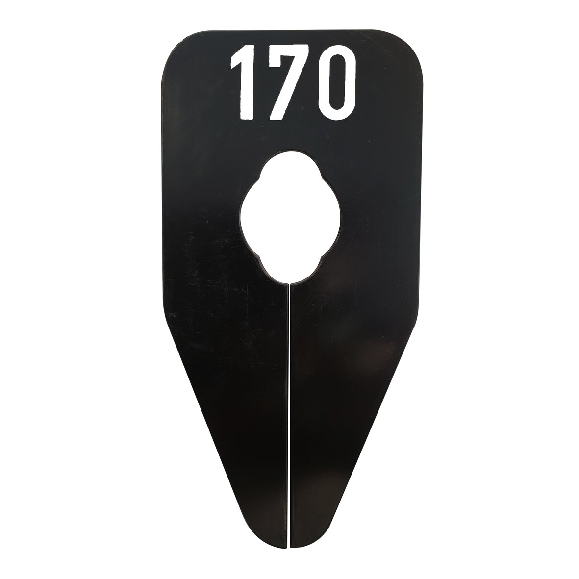 Ovaalvormig maatbordje in het zwart met witte opdruk voor maat 176, geschikt om bijvoorbeeld op een kledingrek te bevestigen.