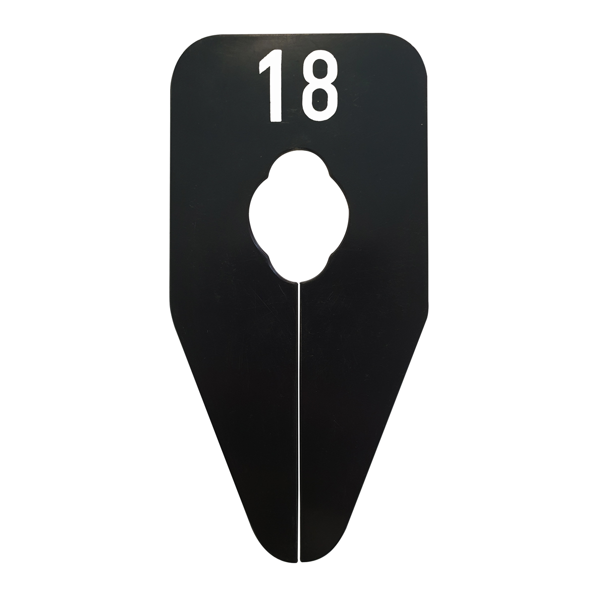Ovaalvormig maatbordje in het zwart met witte opdruk voor maat 18, geschikt om bijvoorbeeld op een kledingrek te bevestigen.