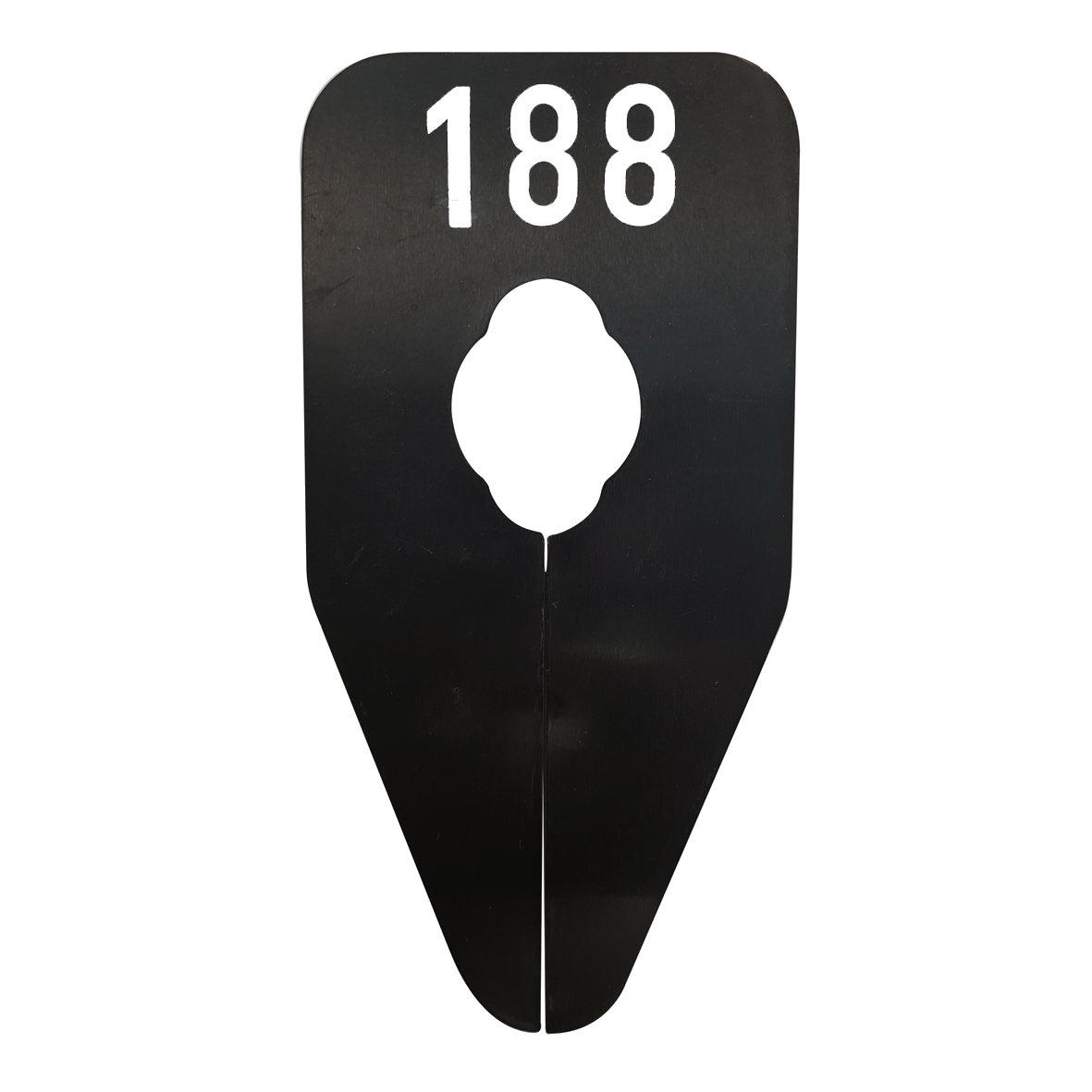Ovaalvormig maatbordje in het zwart met witte opdruk voor maat 188, geschikt om bijvoorbeeld op een kledingrek te bevestigen.