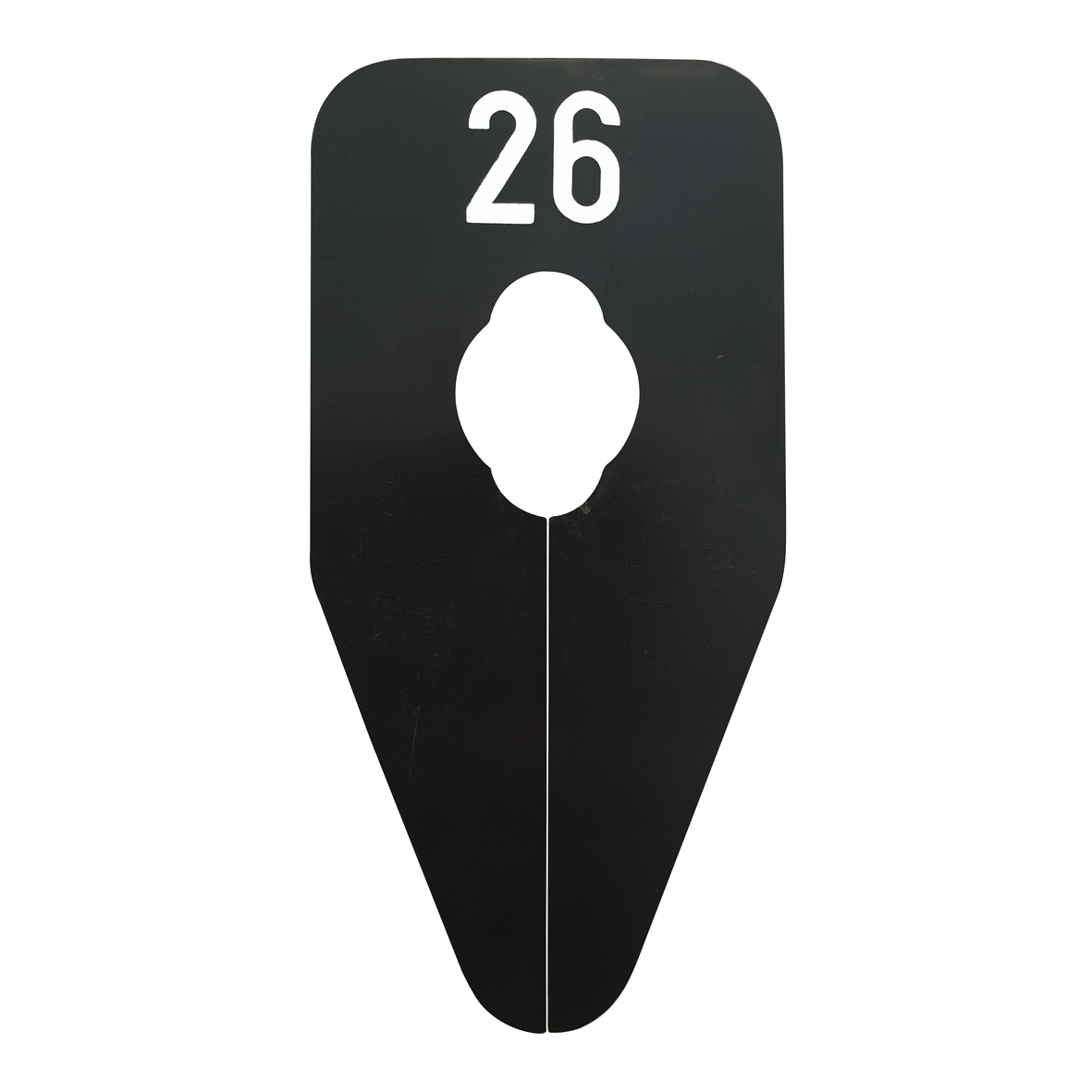 Ovaalvormig maatbordje in het zwart met witte opdruk voor maat 26, geschikt om bijvoorbeeld op een kledingrek te bevestigen.
