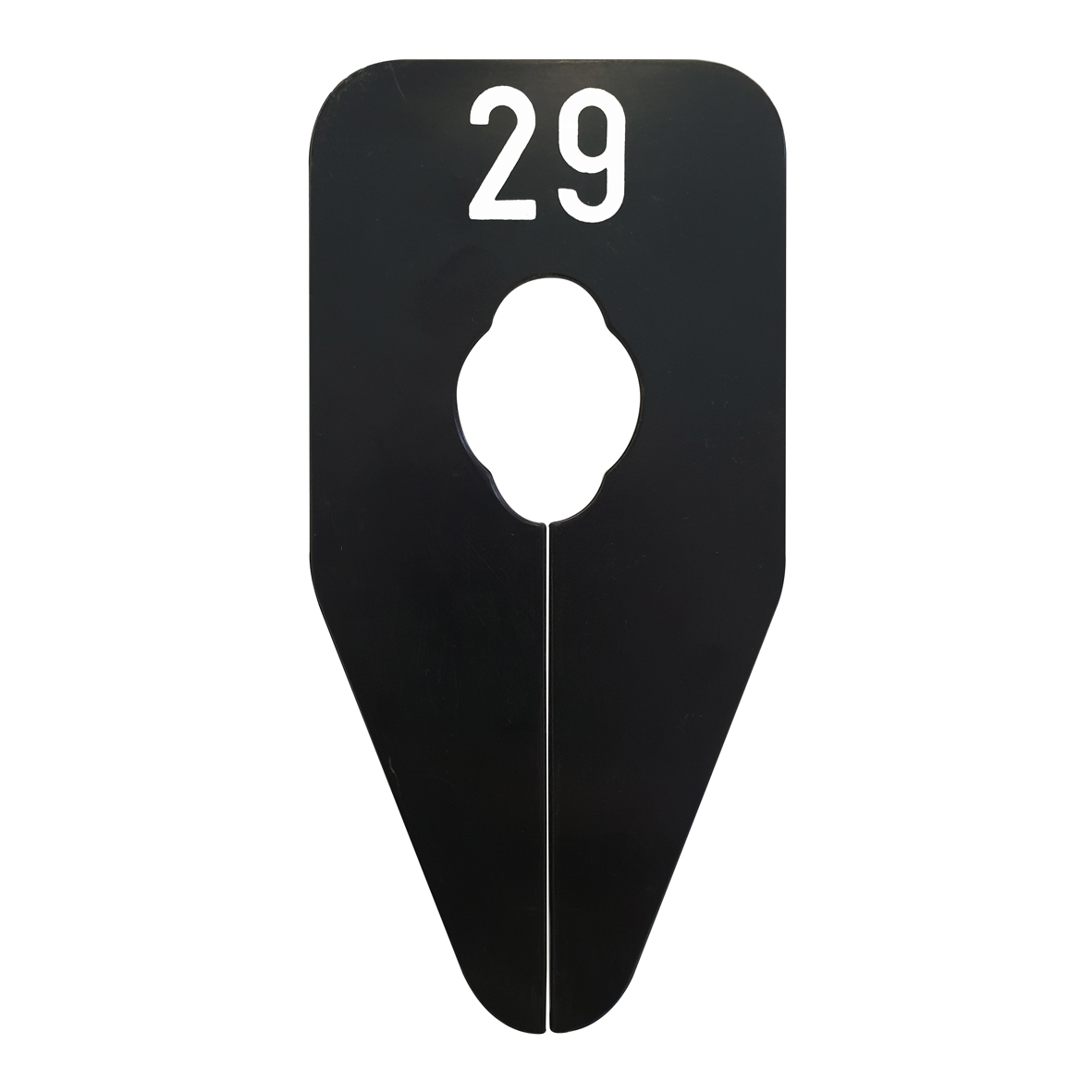 Ovaalvormig maatbordje in het zwart met witte opdruk voor maat 29, geschikt om bijvoorbeeld op een kledingrek te bevestigen.