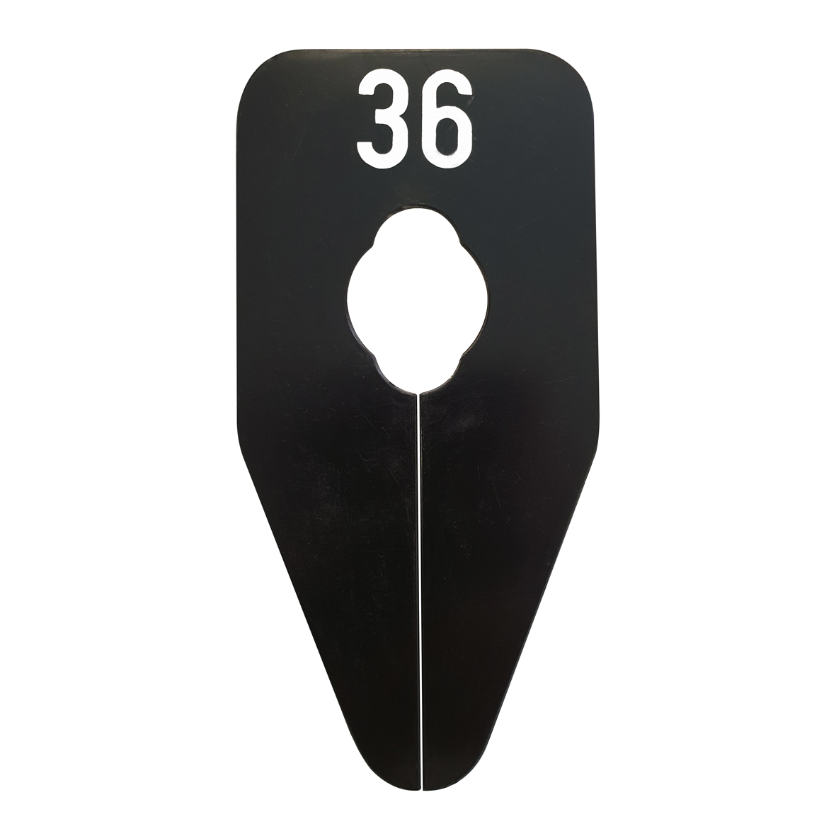 Ovaalvormig maatbordje in het zwart met witte opdruk voor maat 36, geschikt om bijvoorbeeld op een kledingrek te bevestigen.
