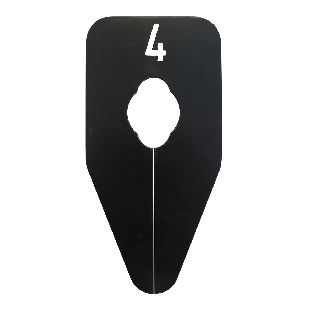 Ovaalvormig maatbordje in het zwart met witte opdruk voor maat 4, geschikt om bijvoorbeeld op een kledingrek te bevestigen.