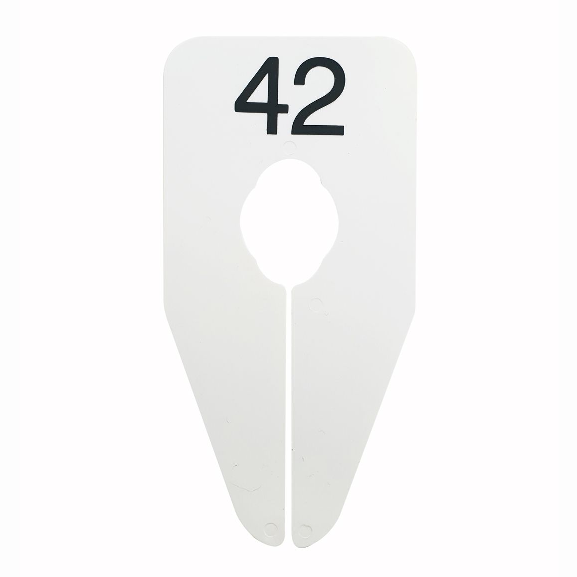 Ovaalvormig maatbordje in het wit met zwarte opdruk 42, geschikt om bijvoorbeeld op een kledingrek te bevestigen.