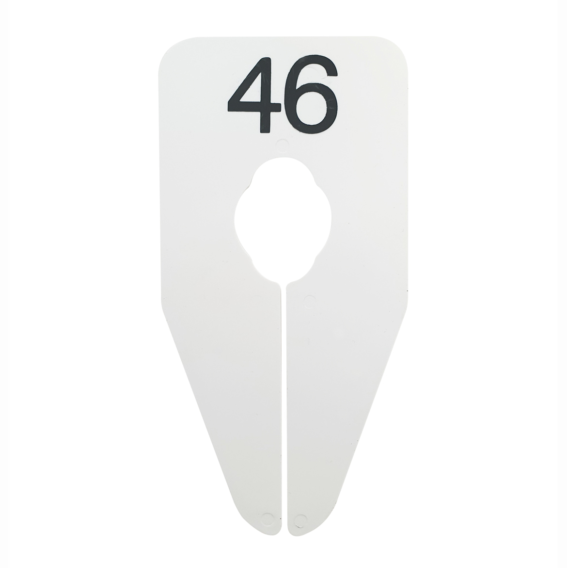 Ovaalvormig maatbordje in het wit met zwarte opdruk 46, geschikt om bijvoorbeeld op een kledingrek te bevestigen.