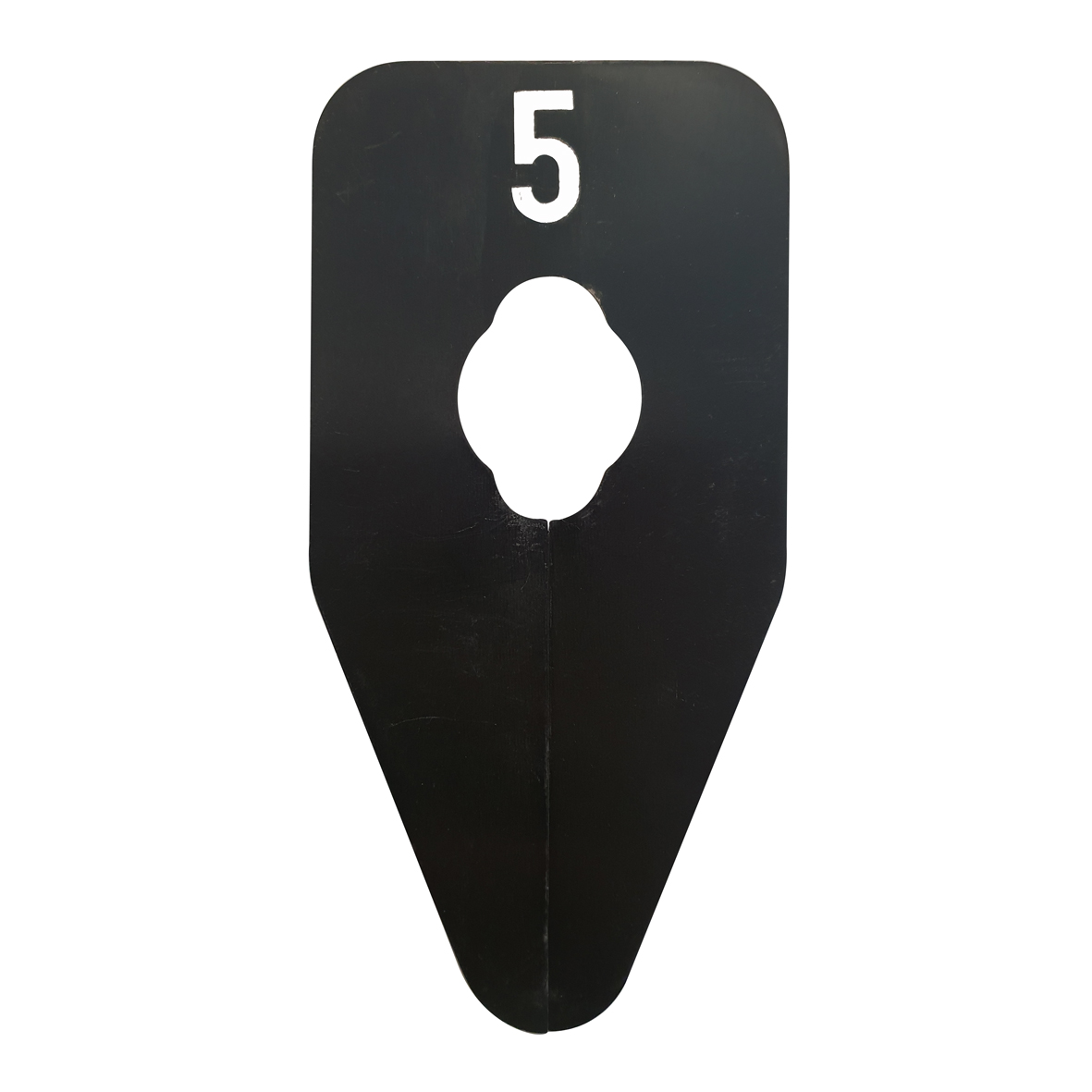 Ovaalvormig maatbordje in het zwart met witte opdruk voor maat 5, geschikt om bijvoorbeeld op een kledingrek te bevestigen.