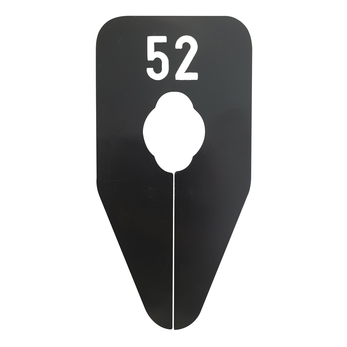 Ovaalvormig maatbordje in het zwart met witte opdruk voor maat 52, geschikt om bijvoorbeeld op een kledingrek te bevestigen.