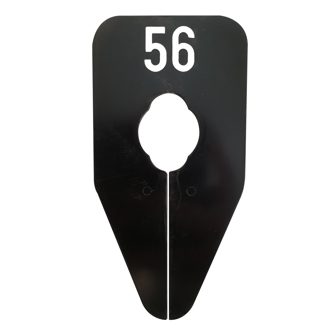 Ovaalvormig maatbordje in het zwart met witte opdruk voor maat 56, geschikt om bijvoorbeeld op een kledingrek te bevestigen.