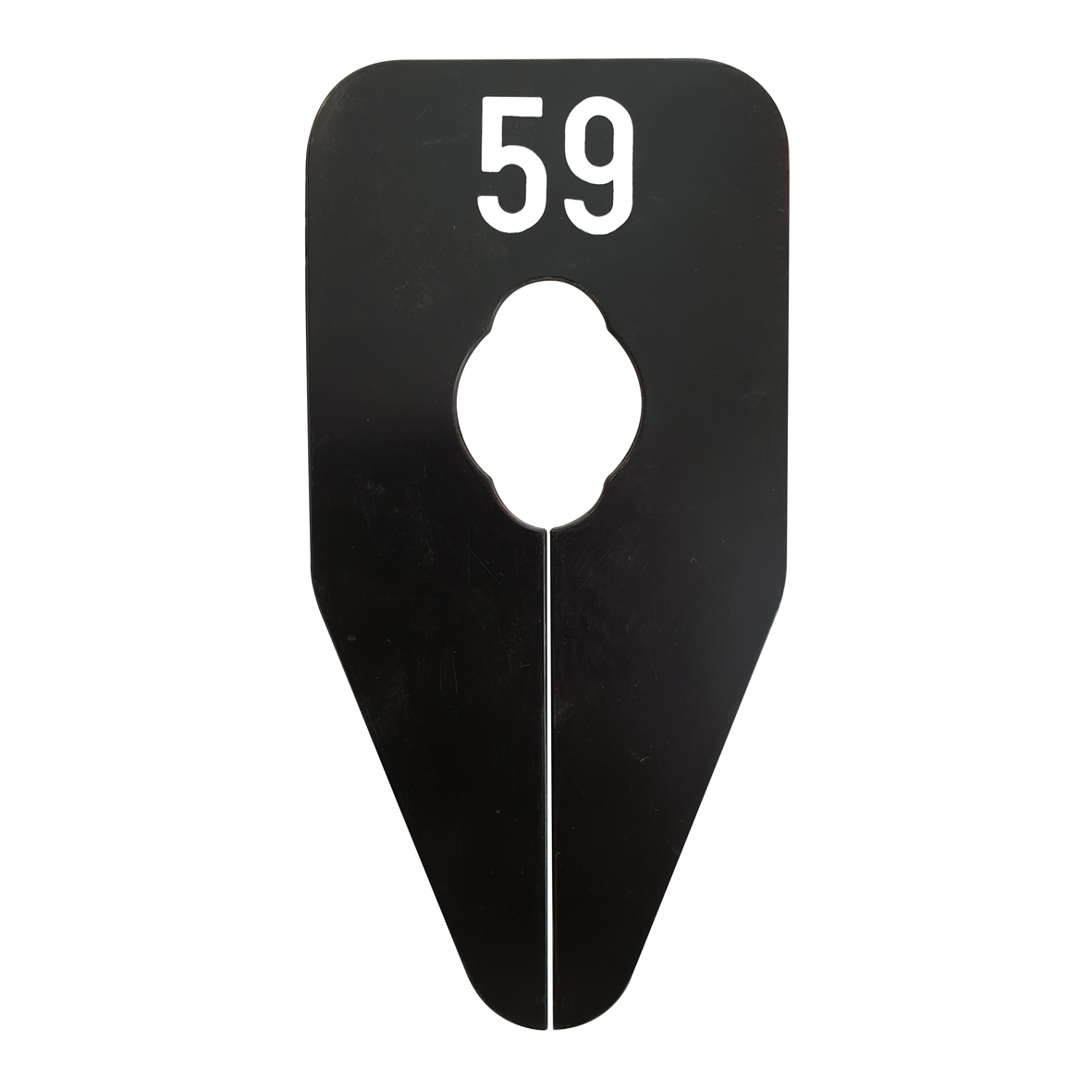 Ovaalvormig maatbordje in het zwart met witte opdruk voor maat 59, geschikt om bijvoorbeeld op een kledingrek te bevestigen.
