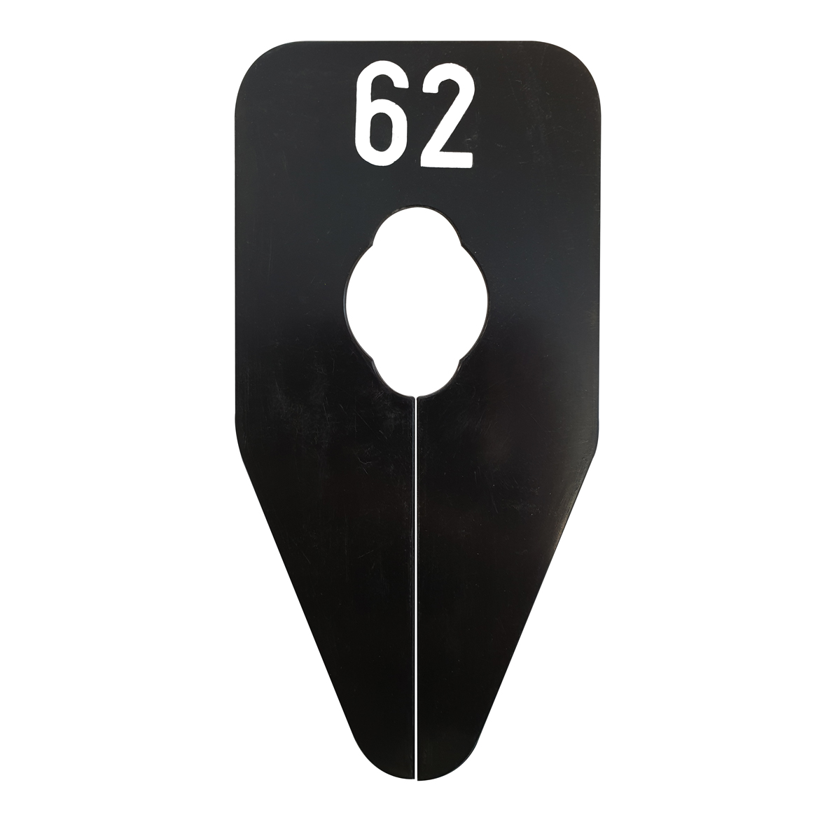 Ovaalvormig maatbordje in het zwart met witte opdruk voor maat 68, geschikt om bijvoorbeeld op een kledingrek te bevestigen.