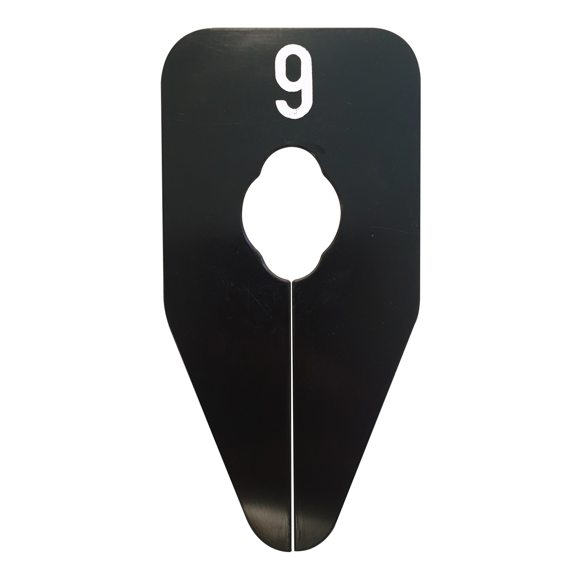 Ovaalvormig maatbordje in het zwart met witte opdruk voor maat 9, geschikt om bijvoorbeeld op een kledingrek te bevestigen.