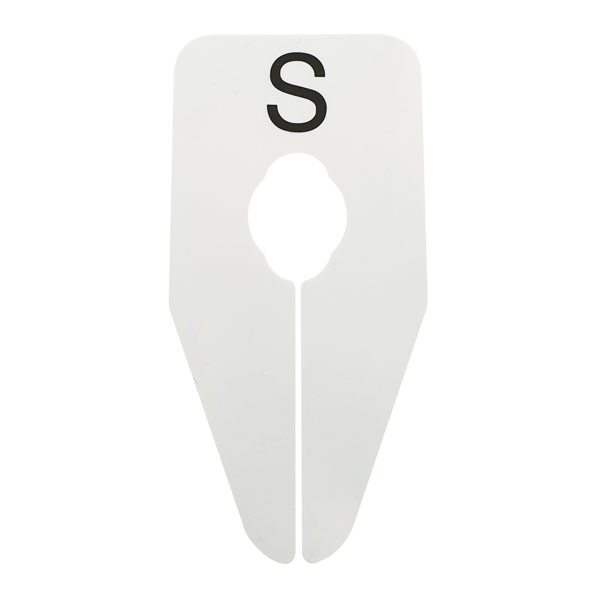 Ovaalvormig maatbordje in het wit met zwarte opdruk S, geschikt om bijvoorbeeld op een kledingrek te bevestigen.