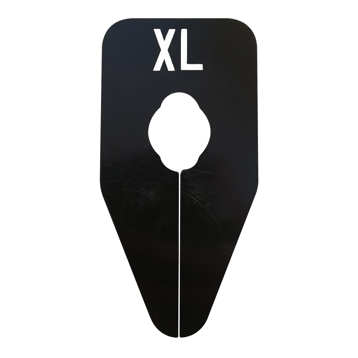 Ovaalvormig maatbordje in het zwart met witte opdruk voor maat XL, geschikt om bijvoorbeeld op een kledingrek te bevestigen.