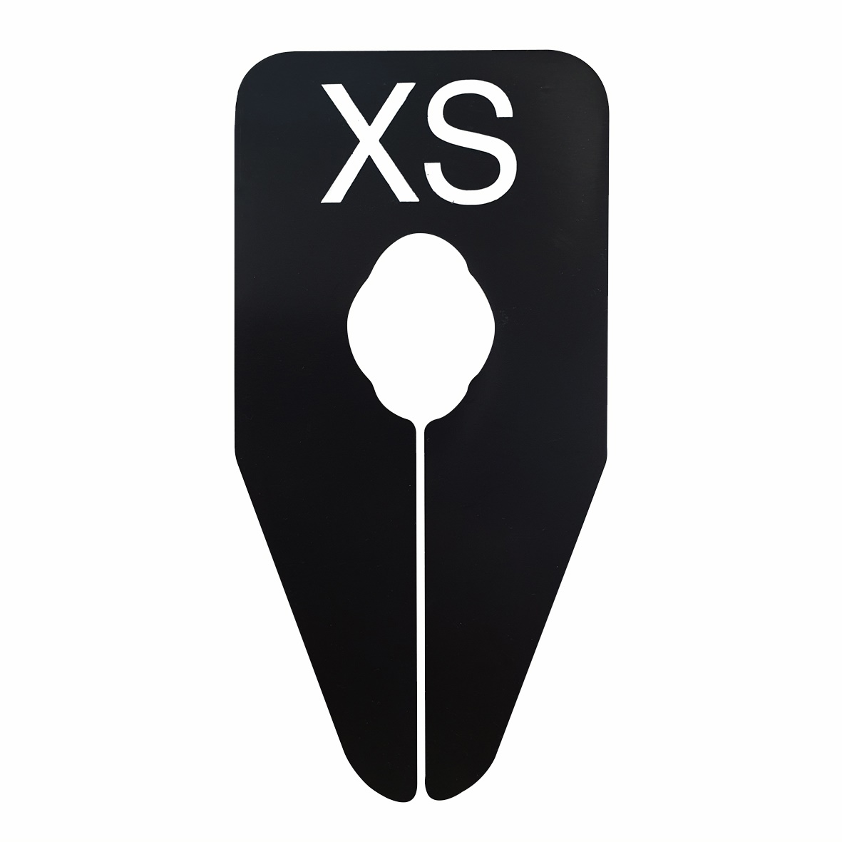 Ovaalvormig maatbordje in het zwart met witte opdruk voor maat XS, geschikt om bijvoorbeeld op een kledingrek te bevestigen.