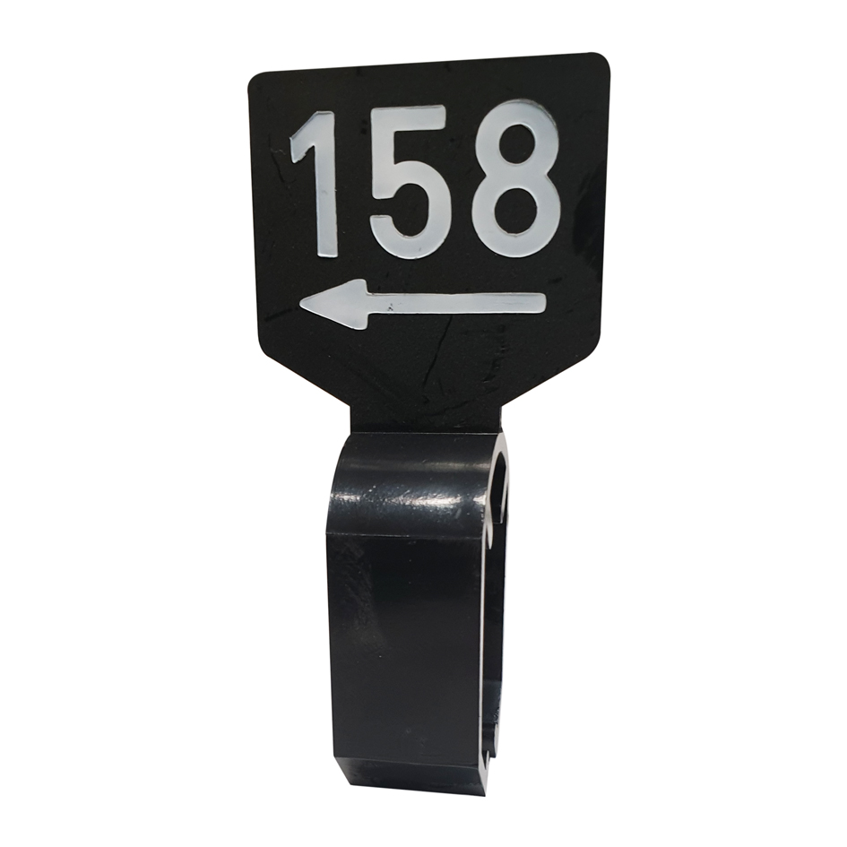 De maatbordjes zijn zwart en dubbelzijdig bedrukt met witte opdruk 158.