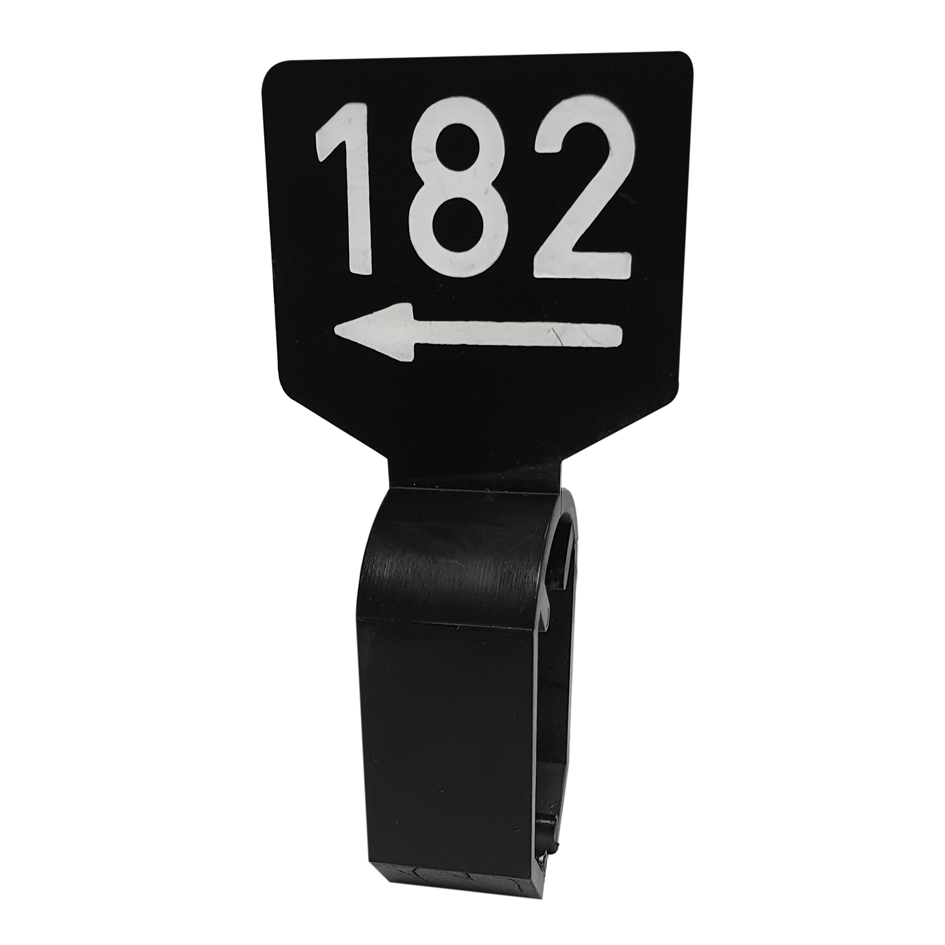 De maatbordjes zijn zwart en dubbelzijdig bedrukt met witte opdruk 182.