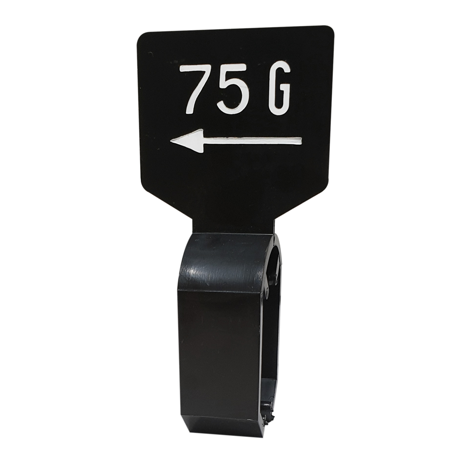 De maatbordjes zijn zwart met een witte opdruk 75G en zijn dubbelzijdig bedrukt.