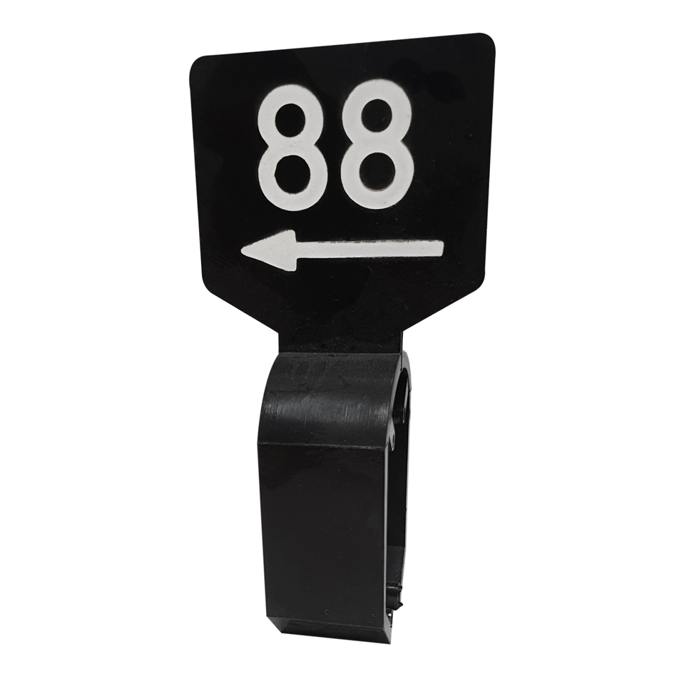 De maatbordjes zijn zwart en dubbelzijdig bedrukt met witte opdruk 86.